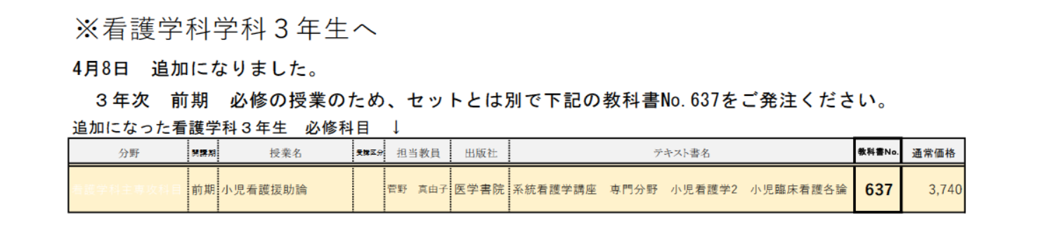 2026年4月8日 / 最終更新日時 : 2026年4月8日 nisshindo22 お知らせ 看護学科3年生へ 必修科目テキスト追加(セットとは別に購入が必要です) 看護学科3年生へ シラバス変更により、3年次前期の必修授業で使用するテキストが1点 追加になりました。 店頭および、Webにて追加発注をお願いいたします。 ※看3セットには含まれないため、別途ご購入が必要です \ 最新情報をチェック /